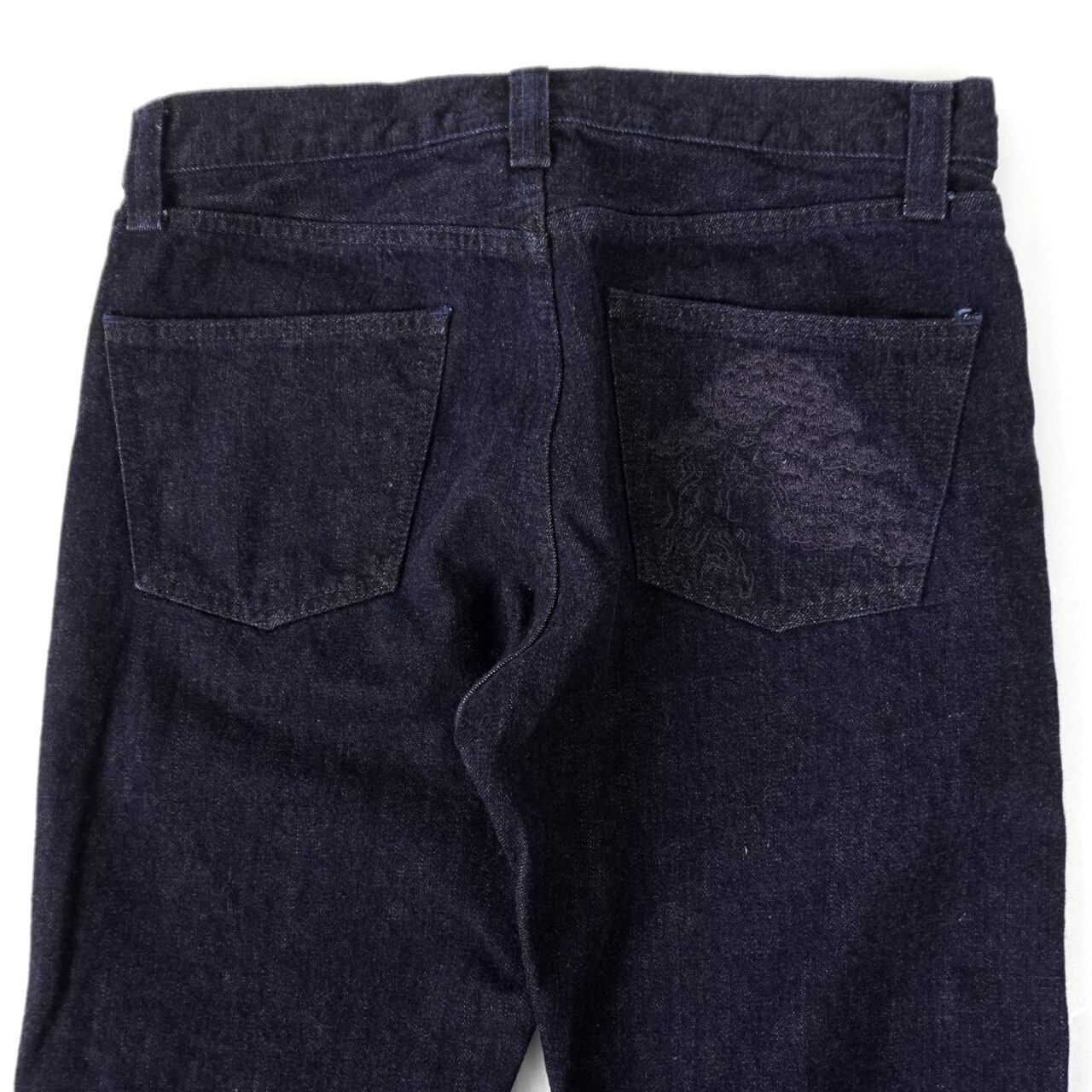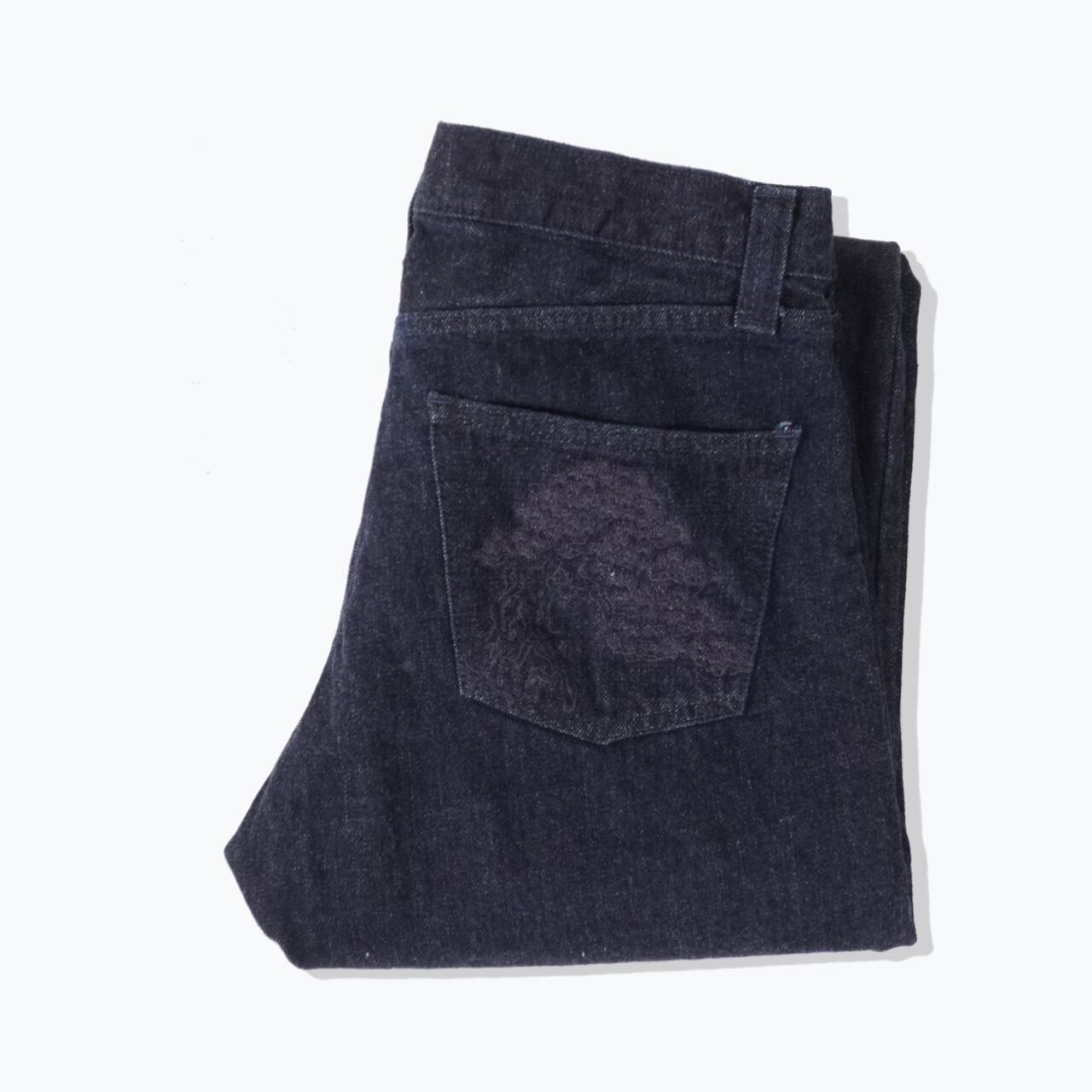 BONSAI DENIM 盆栽刺繍 ダークステッチ 5ポケット ストレートジーンズ ワンウォッシュ ネイビー盆栽刺繍 松柄 MATSU Pine bonsai jeans 盆栽ジーンズ 岡山児島製 日本製 伝統 盆栽デニム 倉敷ジーンズ kojima kurashiki jeans お土産 プレゼント | yield