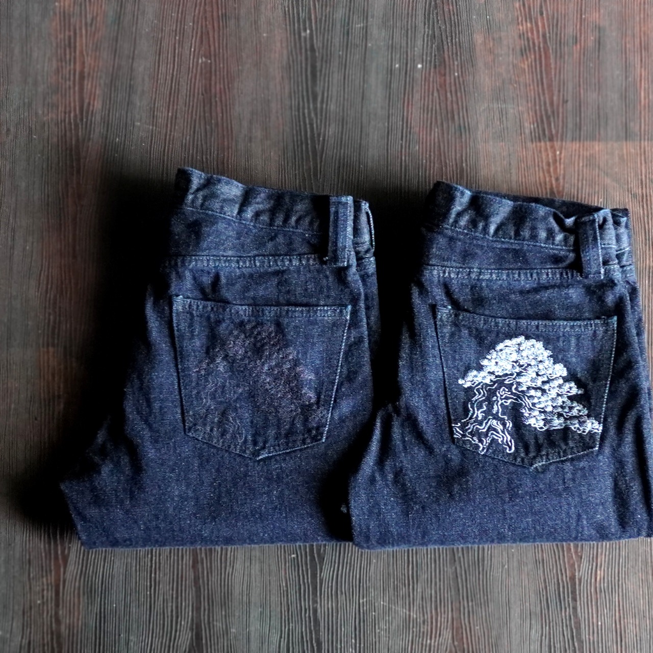 バックポケットにはっきりと魅せる白糸の盆栽刺繍と、経年変化で浮かび上がる紺色糸の盆栽刺繍の2バリエーションにて登場です。