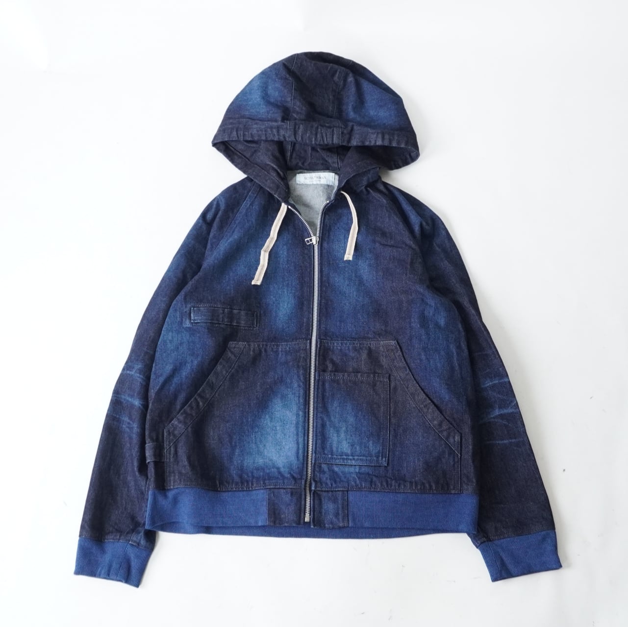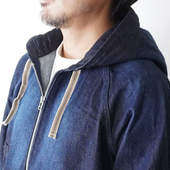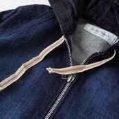 野がけをテーマにアウトドアアレンジを施したデニムジャケット。野がけとは、春や秋に、飲食物を持参して野山を遊び歩くこと。花見や紅葉狩りなどの野遊び。野掛け遊びを指す。ベースは国産のデニム素材をベースに、同じデニム生地を切替えた作り。ハンマーループやミニポケットなど機能性にも優れ、アウトドアはもちろんDIYなどの日曜大工など、趣味の場で使いやすい作りとなっている。また児島職人によるリアルな中古加工にもこだわり、リブの洗いざらしの雰囲気など、美しいエイジングも楽しめるアイテム。シルエットはトレンドのビッグサイズを採用。大き目のフードとリラックスした身幅・長めの袖丈となっており、ルーズな
