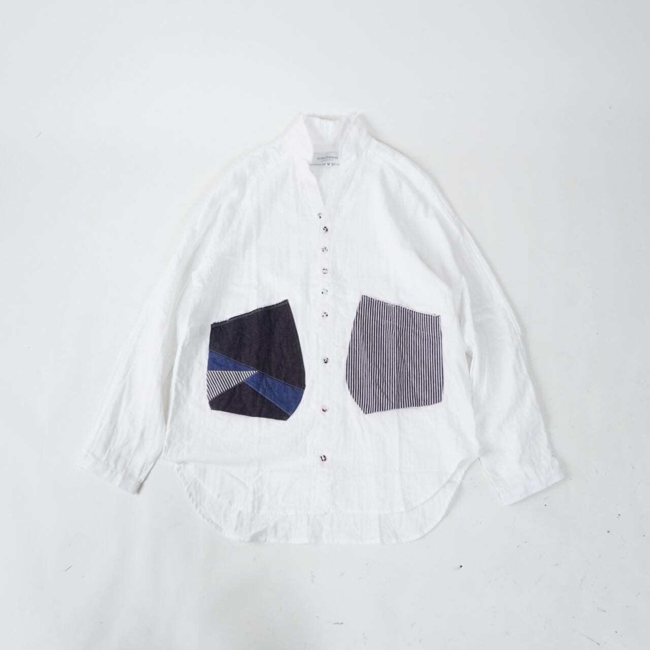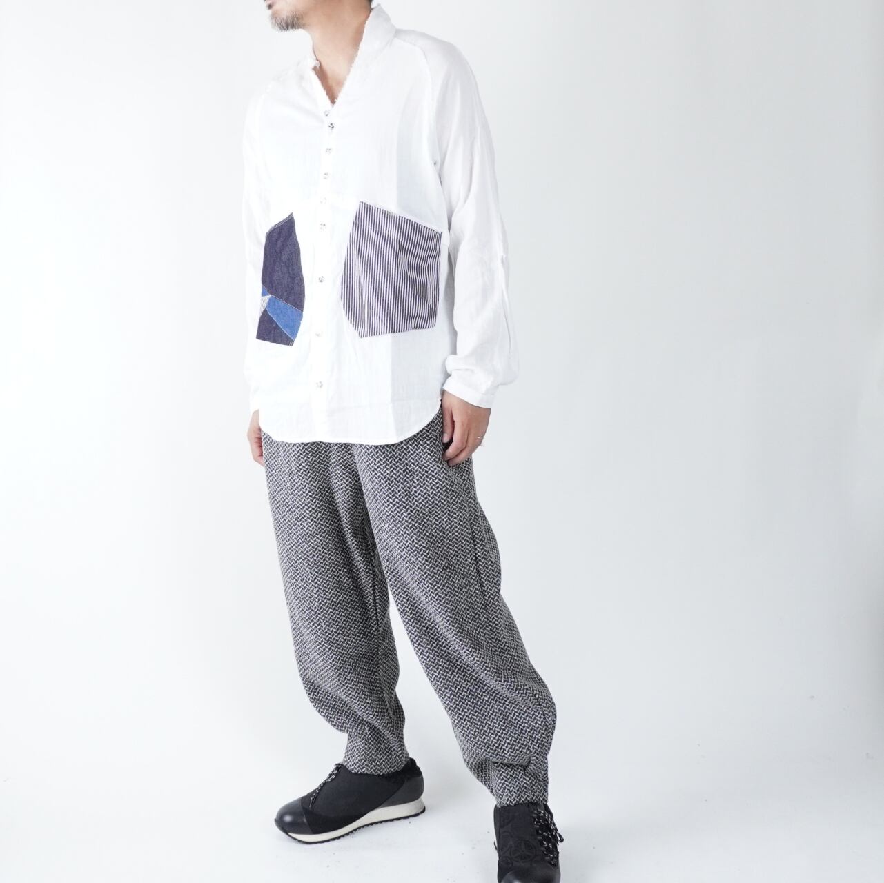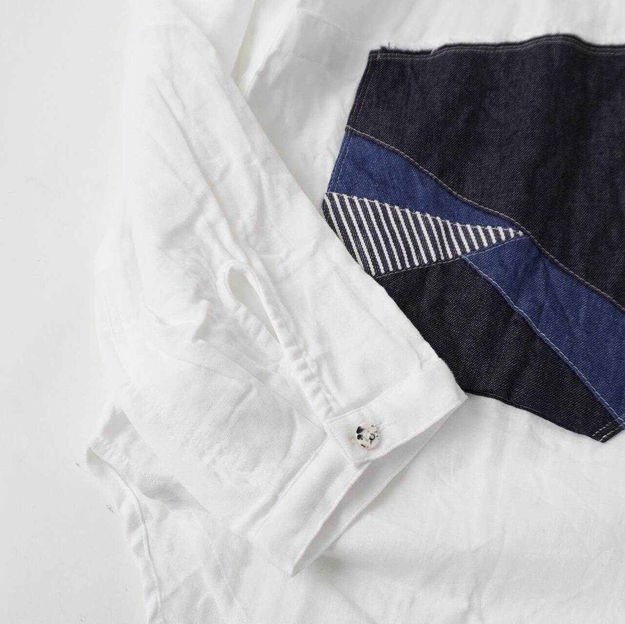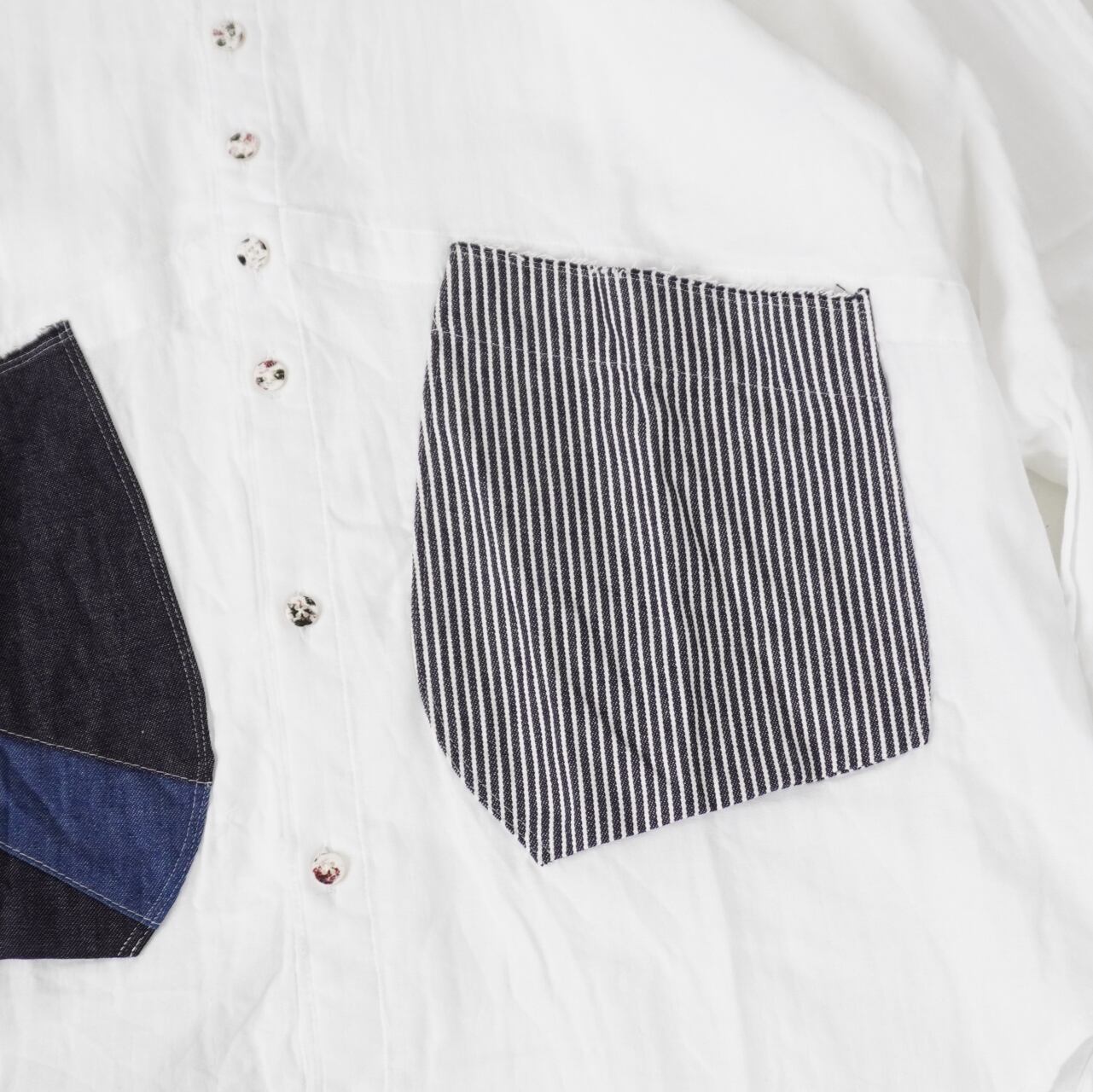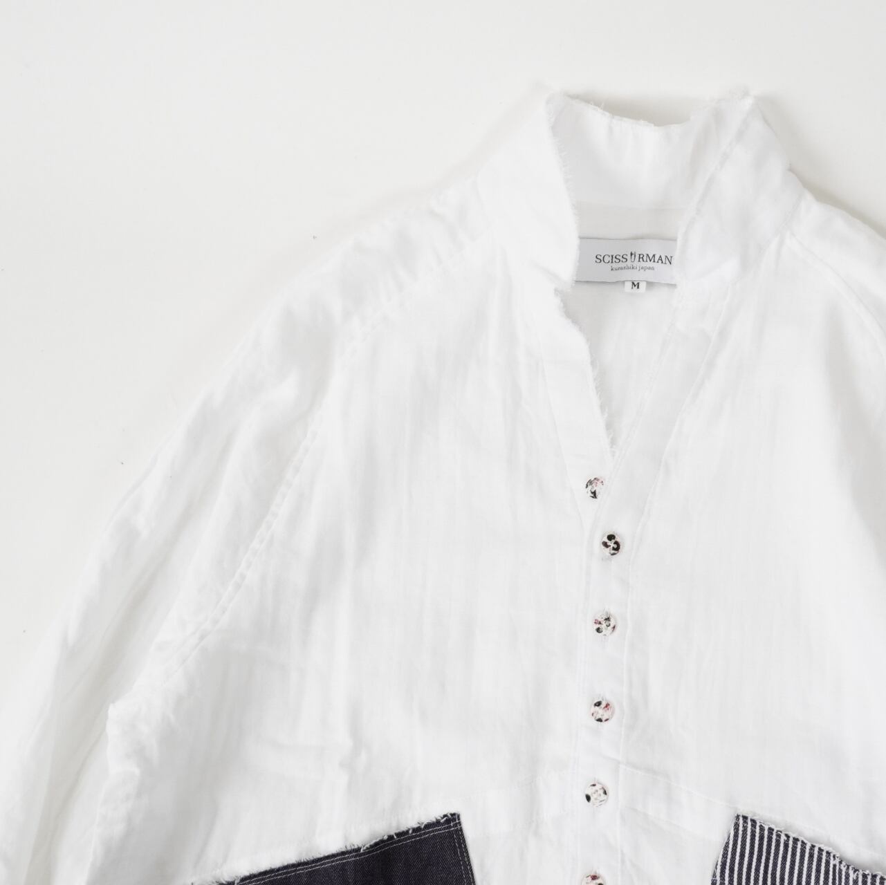 SCISSORMAN sm-3010b JUBAN 半襦袢 Wガーゼ立ち襟Vネック長袖シャツ ホワイト リメイクデニム ヒッコリーポケット 日本製 メンズ 和装 和柄 デニム
