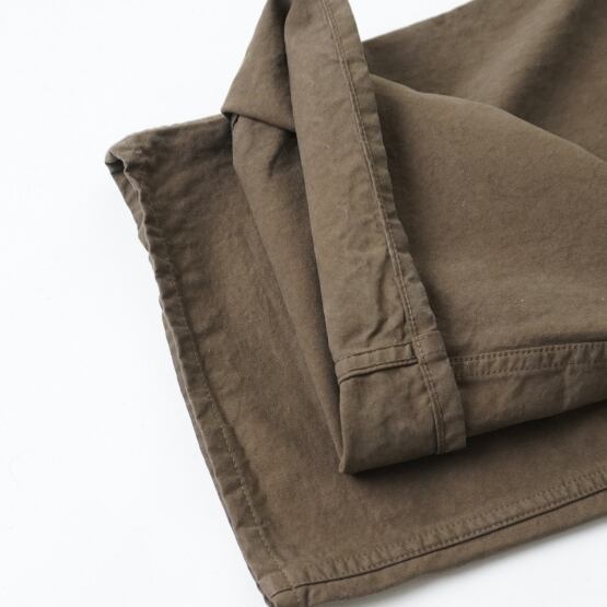 仕上がりとなっています。斜文織とは経糸と緯糸を交差させて織られていて、厚手でありながら、伸縮性があるために、足袋の底時、醤油こし、帆布、相撲の稽古用まわしなど資材として様々な用途に利用されています。ジーンズのように長年の着用で肌に馴染んでくる一生モノの一本となるでしょう。