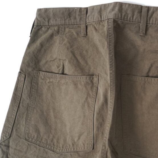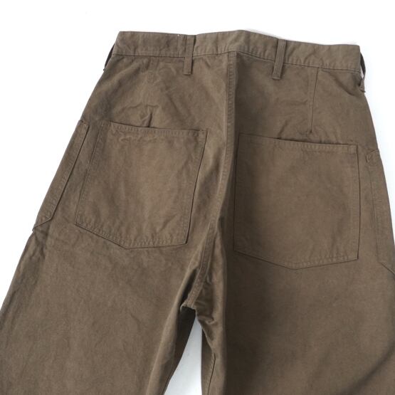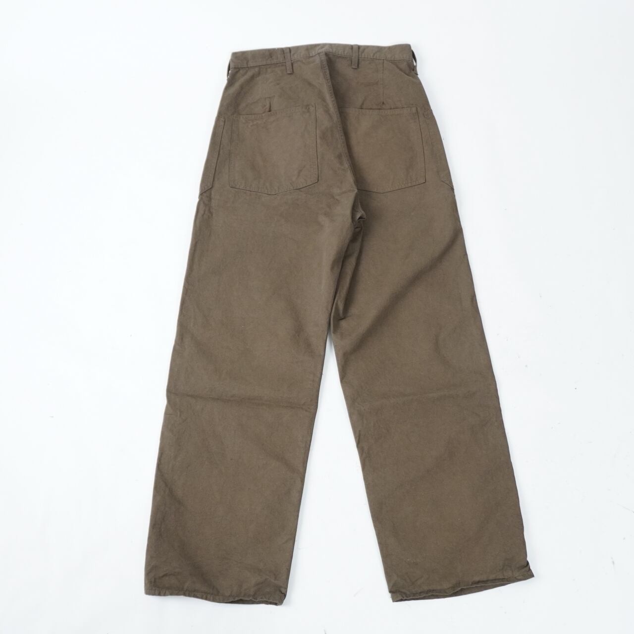 2023AW商品「Old Japanese Twill USN Trousers」のご紹介となります。WWI 時代のU.S.NAVYトラウザーズをモチーフに、サイドシームをまたぐ大きなフロントポケットが特徴的なワイドシルエットのデッキパンツです。昨シーズンより採用している日本のみで織ることができる希少な雲斎織りと呼ばれる斜文織の素材は高密度な上、斜め方向の伸縮性もあり見た目以上のタフさがあります。足袋の底地、醬油こし、帆布、相撲の稽古用まわしなどに使用されてき