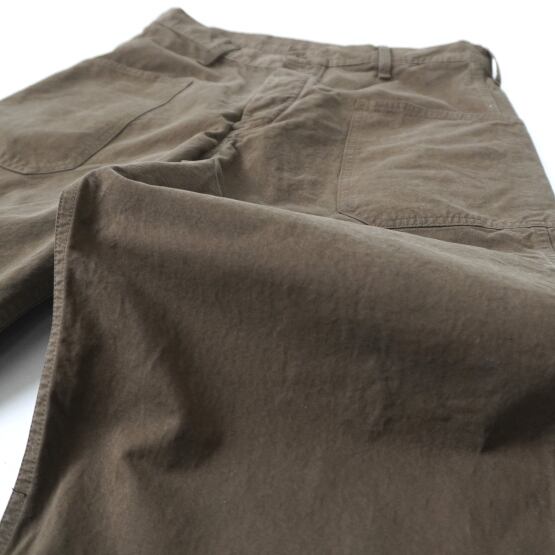 シルエットはウエスト周りはジャストのサイズ感、股上が深く、足まわりはゆったりとしたリラックスストレートタイプです。雲斎織りと呼ばれる斜文織の丈夫な素材は、美作(岡山県)の雲斎によって作られた生地を使ったアイテムで、独特の風合いが楽しめる