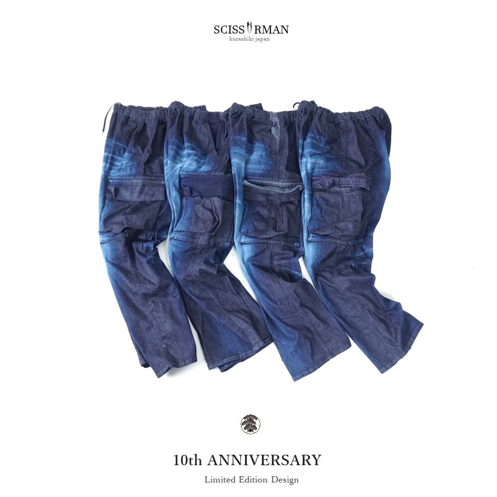 SCISSORMAN 1042 インディゴニットデニム もんぺカーゴパンツ 10周年記念限定 刺子 アーガイル 絣 デニム 岡山児島製 メンズ ユニセックス アニバーサリーモデル ニットデニム 日本製 | yield